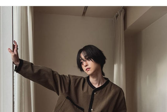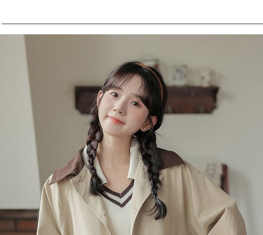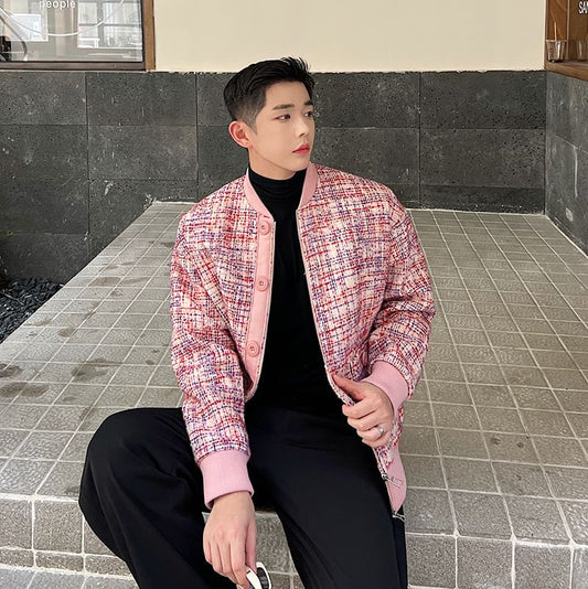 Set: Collar Two Tone Tweed Button Jacket + High Rise Plain Velvet Midi A-Line Skirt