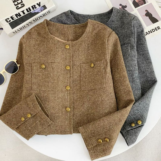 Round Neck Plain Tie-Waist Tweed Button Jacket