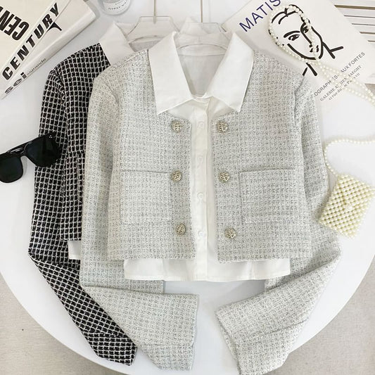 Set: Plaid Tweed Crop Button Jacket + Sleeveless Plain Shirt