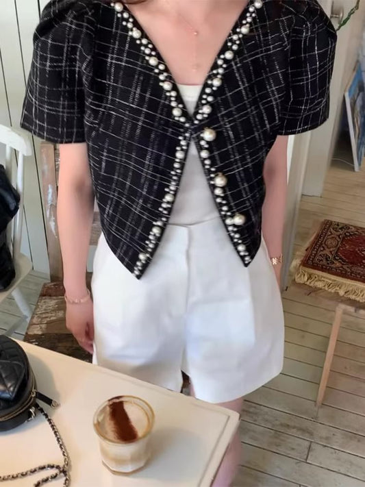 Short Sleeve V-Neck Faux Pearl Beaded Tweed Jacket