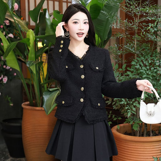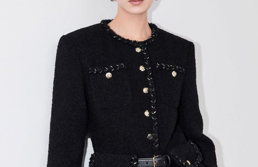 Crew Neck Braided Trim Button-Up Tweed Slit Jacket