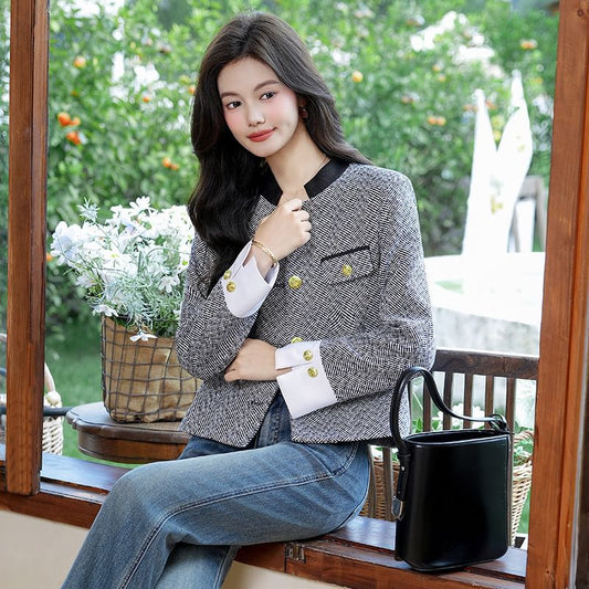 Crewneck Button-Up Plaid Tweed Crop Jacket