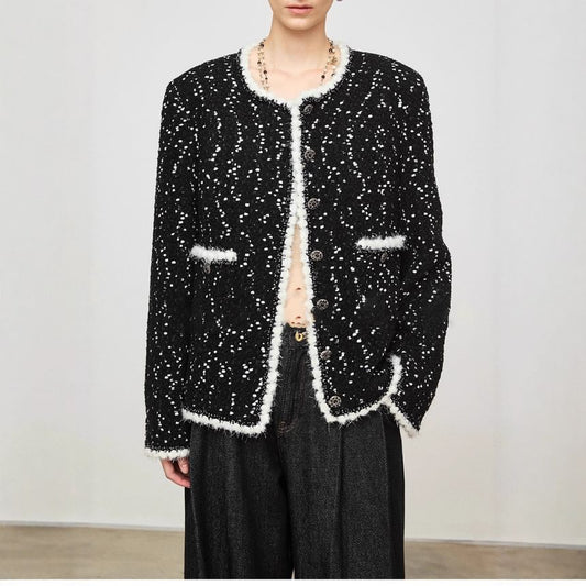 Crew Neck Contrast Trim Fringed Open Front Tweed Jacket