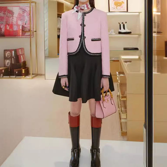 Crew Neck Contrast Trim Button-Up Tweed Crop Jacket