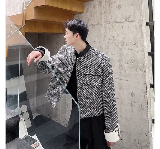 Crew Neck Plaid Button-Up Tweed Crop Jacket