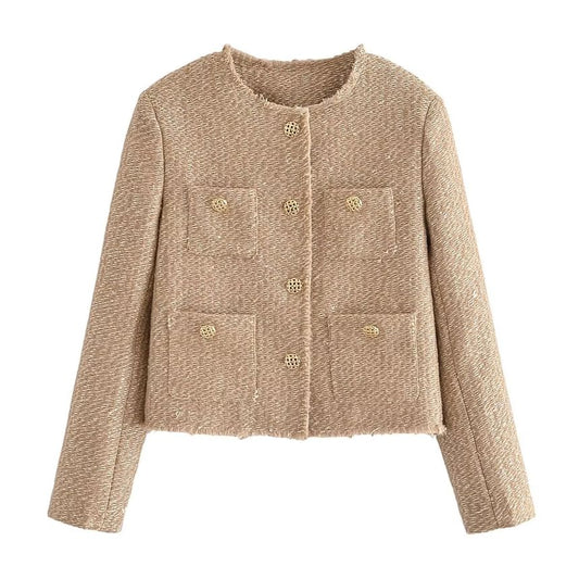 Crew Neck Plain Tweed Frayed Button-Up Jacket