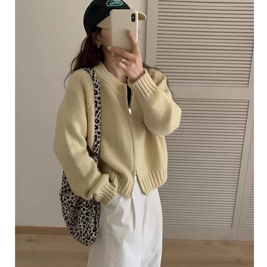 Crew Neck Plain Zip Knit Jacket
