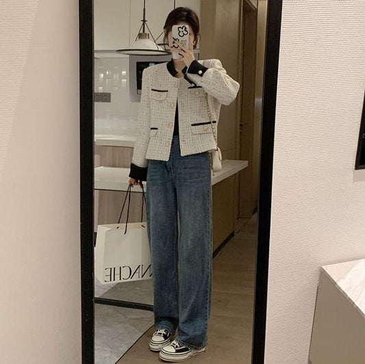 Crew Neck Plain Tweed Double-Breasted Jacket