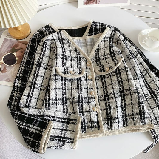 V-Neck Tweed Faux Pearl Buttoned Crop Jacket