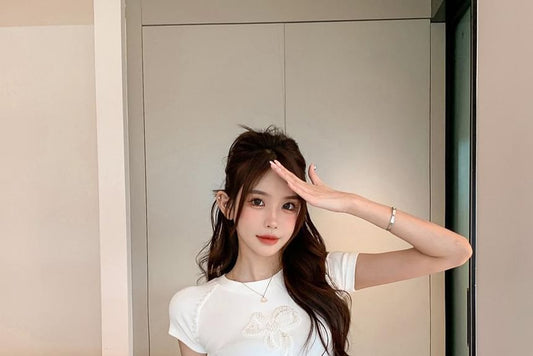 Short Sleeve Square Neck Lace Trimmed Cropped Top