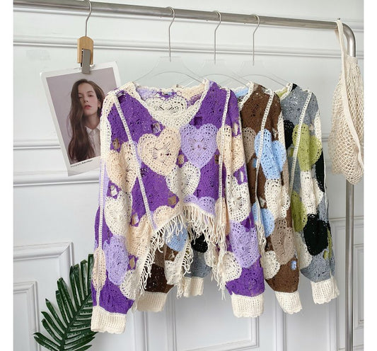 Long-Sleeve V-Neck Heart Print Tasseled Crop Pointelle Knit Top