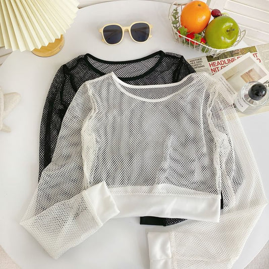 Long-Sleeve Crew Neck Plain Mesh Crop Top