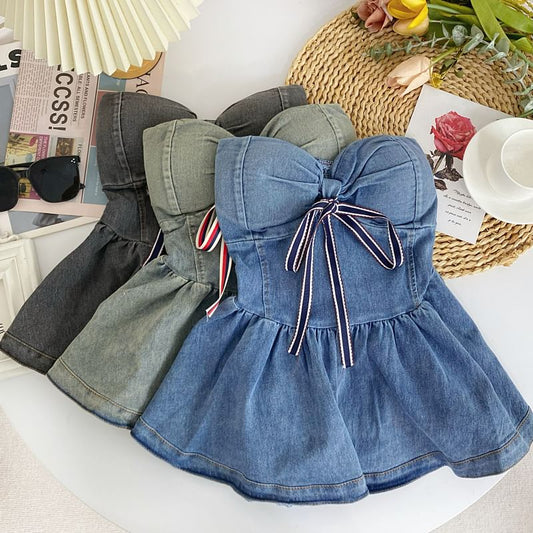 Bow Peplum Washed Denim Tube Top