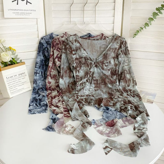 Long-Sleeve V-Neck Print Asymmetrical Mesh Top