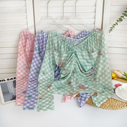 Long-Sleeve V-Neck Plaid Mesh Slim Fit Top
