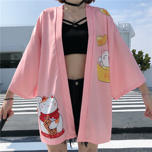 Lucky Cat Print Cardigan Kimono Outerwear
