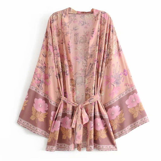 Pink Beach Flower Print Belt Robe Cardigan Outerwear