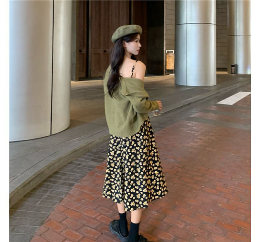 Robe trapèze mi-longue à imprimé floral et bretelles spaghetti/cardigan uni à col en V kk23