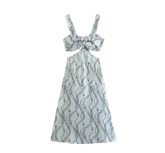 Robe trapèze mi-longue découpée à imprimé chaîne et bretelles spaghetti kk8