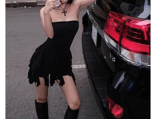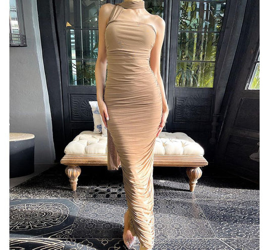 Ensemble : Robe fourreau longue froncée unie à une épaule + gants kk1