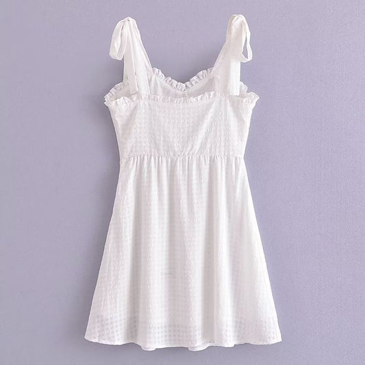 Mini robe trapèze à bretelles spaghetti, col rond, bordure à volants, aa25
