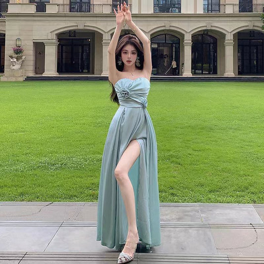 Plain Dress Strapless Maxi Side-Slit A-Line