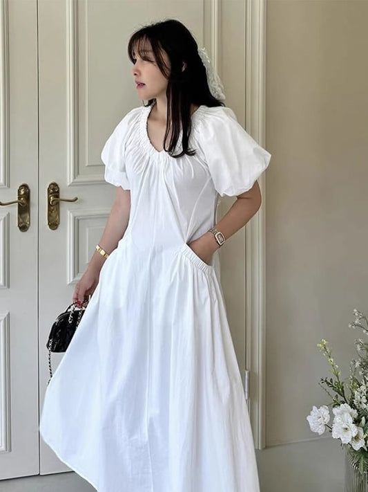Puff Sleeve Square Neck Plain Faux Pearl Ruched Mesh A-Line Evening Gown / Midi Cocktail Dress