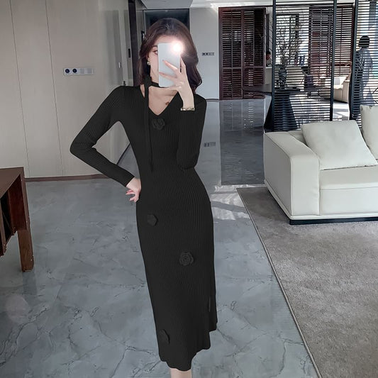 Long-Sleeve V-Neck Plain Flower Accent Slit Midi Sheath Dress
