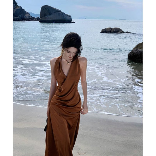 Halter-Neck Plain Midi A-Line Tiered Dress
