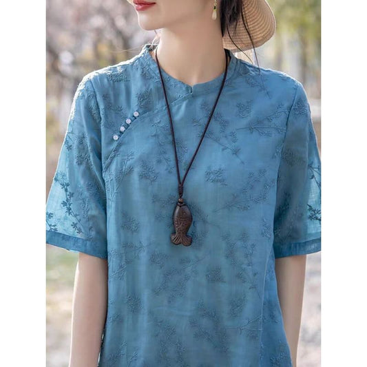 Short Sleeve Mandarin Collar Floral Embroidered Midi A-Line Dress