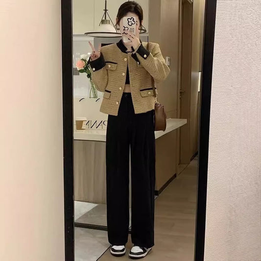 Tweed Button-Up Jacket / Low Rise Washed Wide Leg Jeans