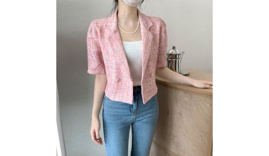 Short-Sleeve Double Breasted Plaid Crop Blazer
