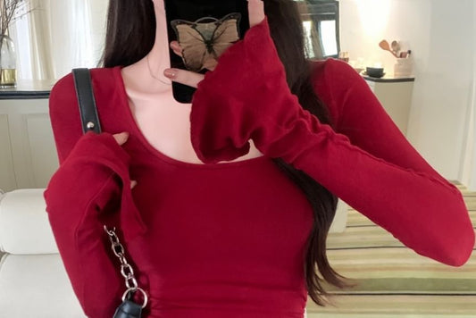 Long-Sleeve V-Neck Plain Ruffled Drawstring Crop Knit Top