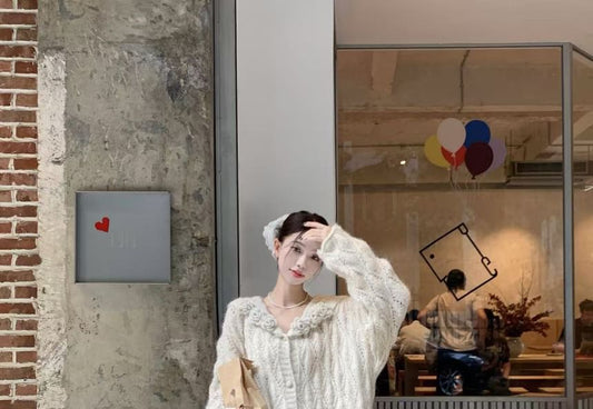 V-Neck Plain Fringed Button-Up Crop Cardigan / Long-Sleeve Lace Blouse