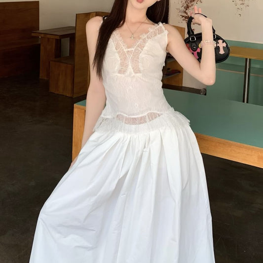 Rise Slim Plain Skirt Tank High Panel Fit Maxi Top / Lace A-Line
