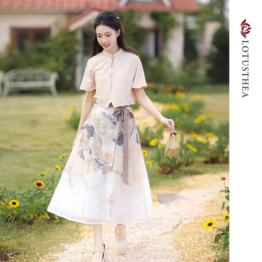 Short-Sleeve Floral Embroidered Keyhole Crop Blouse / High Waist Printed Midi Ma Mian Skirt