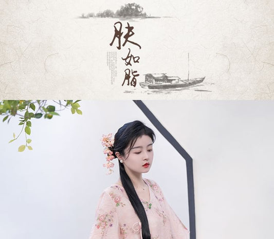 Traditional Chinese Elbow-Sleeve V-Neck Floral Embroidered Sequin Frog Buttoned Blouse / High Rise Print Mini Ma Mian Skirt / Set
