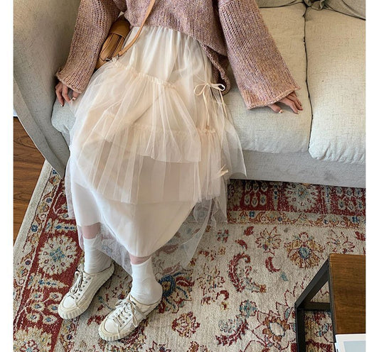 Lolita Flared-Sleeve Mock Neck Patterned Lace Trim Midi A-Line Dress / A-Line Skirt / Tights / Set
