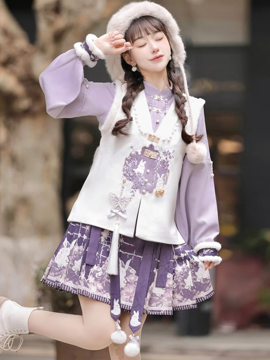 Long-Sleeve Mandarin Collar Lolita Floral Embroidered Fluffy Trim Blouse / V-Neck Rabbit Embroidered Faux Pearl Button Vest / High Waist Print Pleated Mini A-Line Skirt / Charm / Set