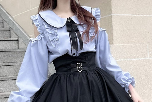 Lolita Collared Plain Ruffle Trim Blouse / High Waist Plain Mini A-Line Skirt