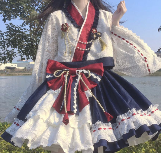 Lolita Lace Trim A-Line Overall Dress / Long-Sleeve Blouse / Petticoat Skirt / Headband / Set