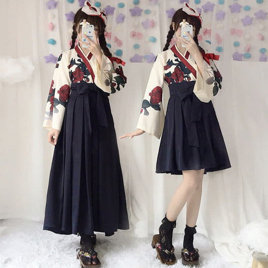 Vintage Rose Flower Print Kimono Shirt Lace Up Pleated Skirt