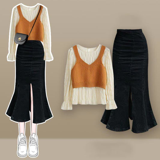 Pure Color Vest Shirt High Waist Fishtail Denim Skirt