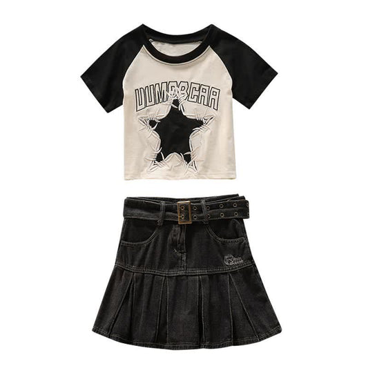 Star Letter Crop Top T-Shirt Belted Denim Skirt