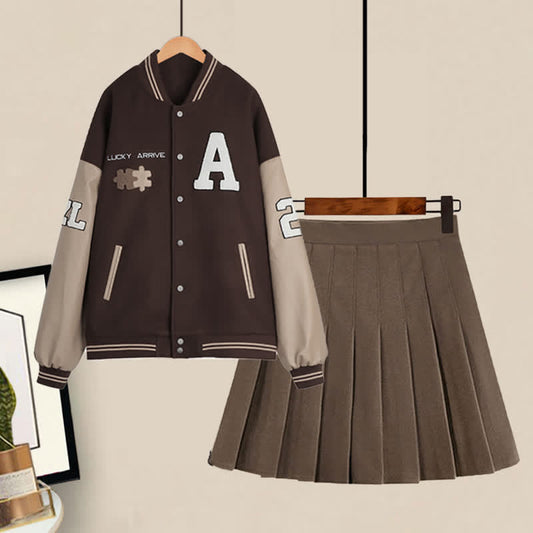 Brown Letter Baseball Jacket Pleated Skirt Set