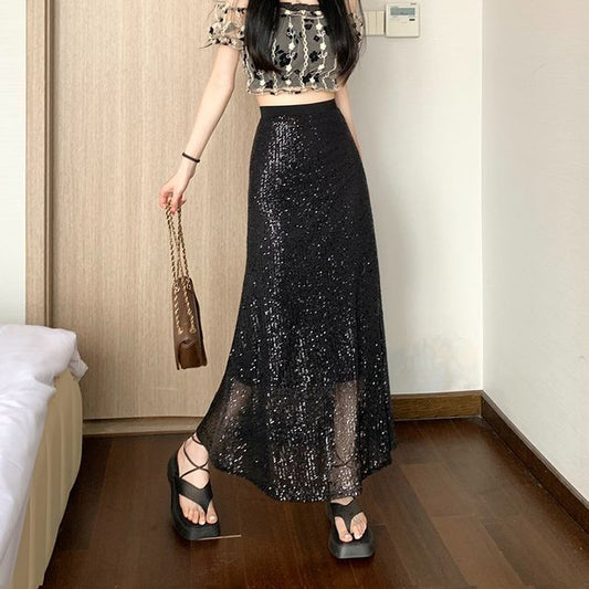 Jupe trapèze mi-longue à sequins taille haute EE33