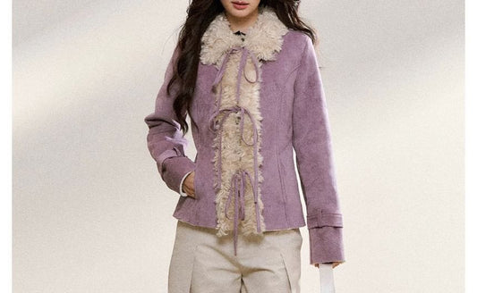 Contrast Stitching Fleece-Lined Fluffy Trim Hooded Zip Jacket
