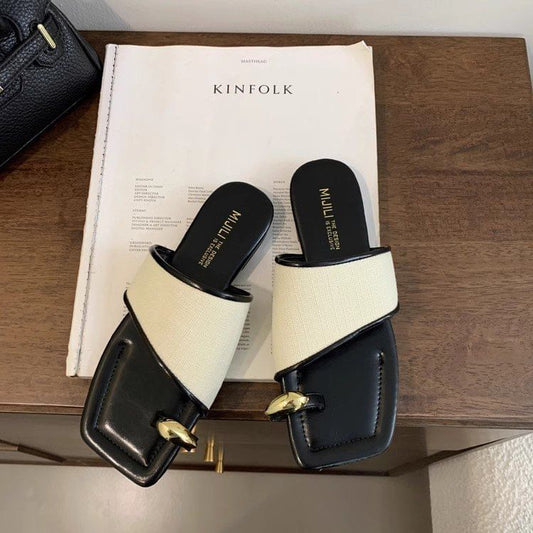 Square Toe Metal Accent Toe Loop Flat Slide Sandals