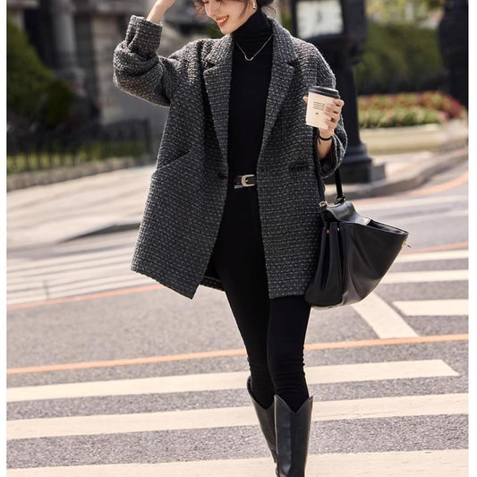 Notch Lapel Single-Breasted Plain Tweed Crop Blazer / High Rise Slit Midi Pencil Skirt