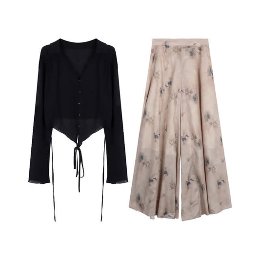 Black Sakura Fox Print Lace Up T-Shirt Wide Leg Pants